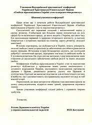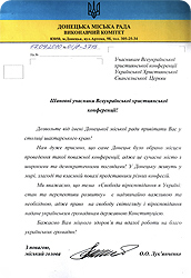 В адрес участников конференции были направлены приветственные письма от Главы Государственного комитета Украины по делам национальностей и религии Богуцкого Юрия Петровича, Народного депутата Украины Стретовича Владимира Николаевича, Донецкого Городского Головы Лукьянченко Александра Алексеевича: