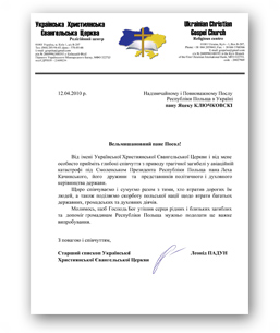 От имени Украинской Христианской Евангельской Церкви и от меня лично примите глубокие соболезнования в связи с трагической гибелью в авиационной катастрофе под Смоленском Президента Республики Польша господина Леха Качинского, его супруги и представителей политического и духовного руководства страны.