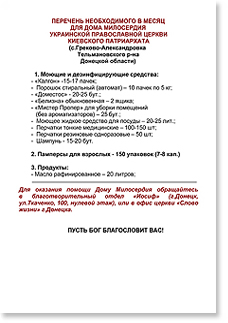 В конце декабря 2010 года, из беседы с архиепископом Украинской Православной Церкви Киевского Патриархата Сергием, я узнал о Доме Милосердия в Тельмановском районе Донецкой области. 11 лет тому назад в селе Греково-Александровка силами священников УПЦ КП было восстановлено полуразрушенное здание бывшей больницы и открыт приют для бедных людей, в котором находятся около 60-70 человек различных категорий населения. Это и старики, оставленные государством и близкими, и тяжелобольные люди, и бомжи. На протяжении многих лет Дому Милосердия оказывали помощь различные спонсоры, которые сейчас отказались от них, ограничив тем самым все средства к существованию приюта. На сегодняшний день Дом Милосердия находится под угрозой закрытия, и десятки тяжелобольных и нуждающихся людей могут опять оказаться на улице.